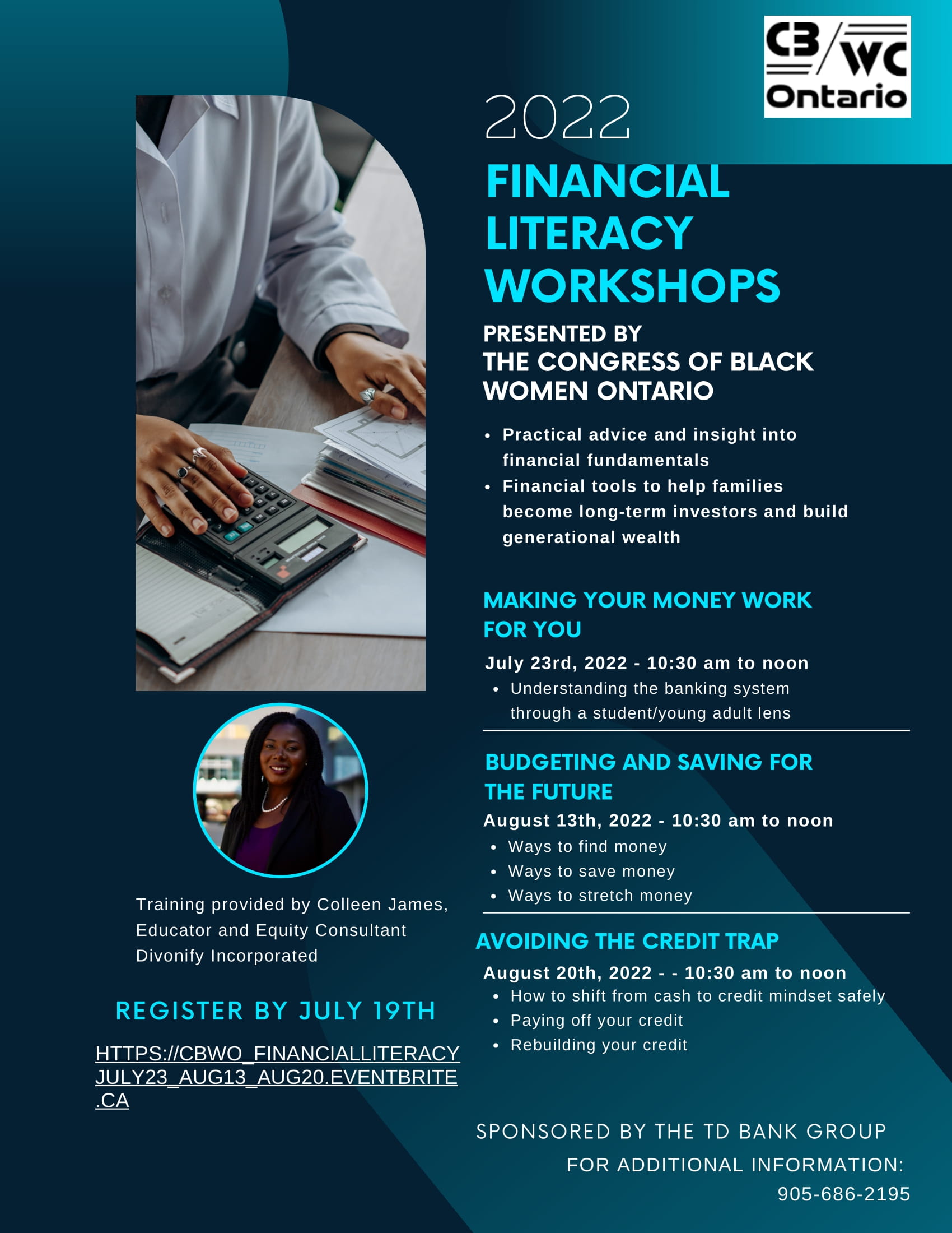 Financial Literacy Workshops (July 23, August 13, August 20, 2022) Registration: https://www.eventbrite.ca/e/financial-literacy-workshops-july-23-august-13-august-20-2022-tickets-344487731077 + Add to Google Calendar + iCal / Outlook export The event is finished. Date Jul 23 2022 Expired! Time 10:30 am - 12:00 pm More Info Event Link Location Zoom Organizer CBWC Event Link Share this event